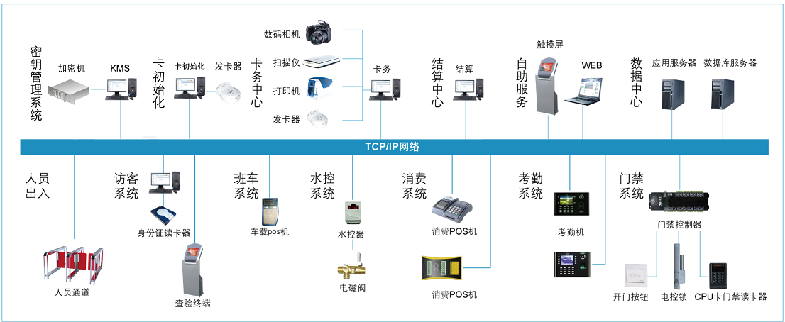 基于射頻卡技術的企業園區一卡通系統是以非接觸式IC卡和軟件平臺為核心,實現企業園區內常見的門禁,考勤,消費,停車場,通道,會議等應用的綜合管理平臺。用戶可將企業內的人、財、物的管理和服務全面納入“一卡通”平臺,系統可實現與OA、ERP、MIS等系統靈活對接,為企業管理者和員工提供方便快捷的服務。系統適用于規模較大和對安全要求較高的企業園區、司法、政府、軍工和金融等行業領域。