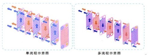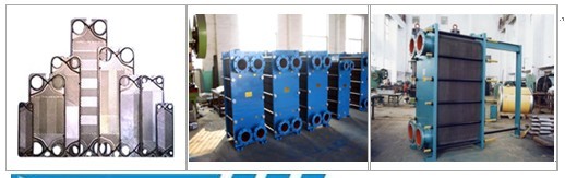 板式換熱器是由高效傳熱板片、密封膠墊、加緊螺栓及框架等主要部件組成。板片四個角開有角孔,鑲貼有密封膠墊的板片安裝在固定加緊板和活動加緊板之間的框架上,用加緊螺栓加緊,密封膠墊按人為設計的流程形式將各傳熱板片密封聯接,形成迷宮式的介質流道,兩種換熱介質在相鄰的流道內互相逆流,形成充分的熱交換。傳熱板片用優質耐腐蝕金屬薄板壓制而成,波紋為人字型,相鄰板片具有反方向的人字型溝槽,溝槽的交叉點相互支撐形成接觸點,介質流動時形成湍流狀態,獲得很高的傳熱效率。