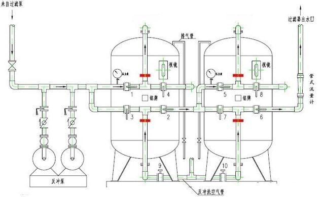 9、過濾器的濾料應(yīng)每年進(jìn)行翻砂整理,并觀察濾料的層度,如發(fā)現(xiàn)濾層減薄,及時補(bǔ)充濾層。